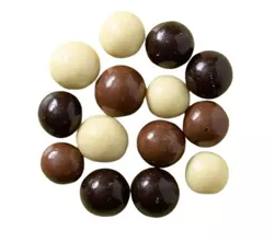 Billes croustillantes d'épeautre enrobées de chocolat noir, chocolat au lait, chocolat blanc